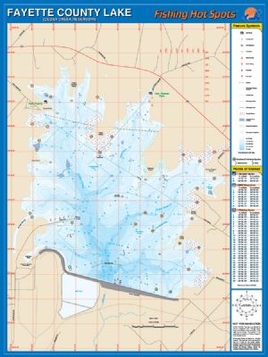 Fayette County Lake, Texas Waterproof Map (Fishing Hot Spots)This map is clean, easy-to-read, and detailed map of the lake. It has a latitude/longitude grid and GPS coordinates. Fishing tips and techniques are included. Size - 24 x 36